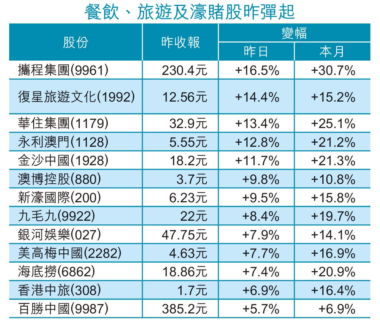 檢疫措施放寬下復甦概念股衝高,除金沙外,永利澳門(1128)亦飆12.8%,兩股本月均累升逾兩成,銀娛昨則升近8%,美高梅中國(2282)漲7.7%;旅遊股以攜程集團(9961)急升16.5%最亮麗,累計本月已走高逾三成,復星旅遊文化(1992)亦揚14.4%,中國國航(753)衝高逾一成。