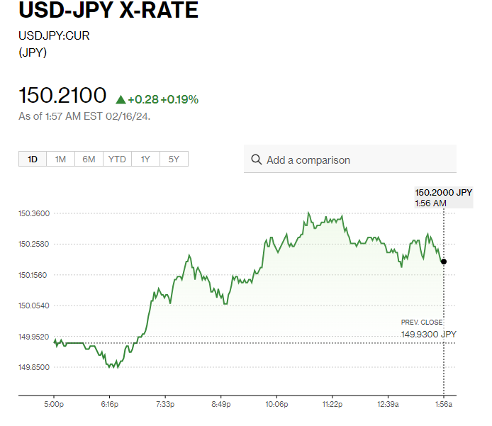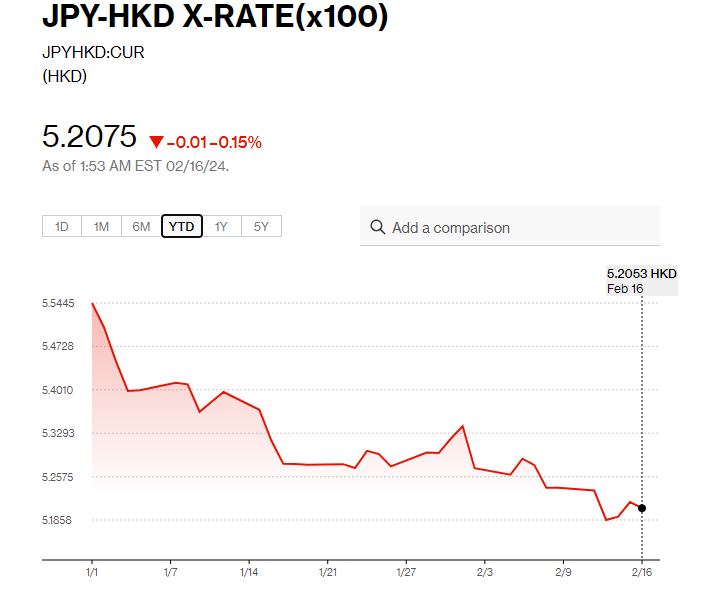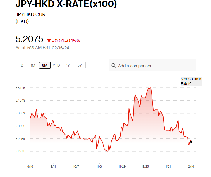 植田和男「放鴿」後,日圓偏軟。截至2月16日下午,每美元兌日圓仍處150水平,報150.21,升0.19%;每百日圓兌港元則見5.2算,跌0.15%。
