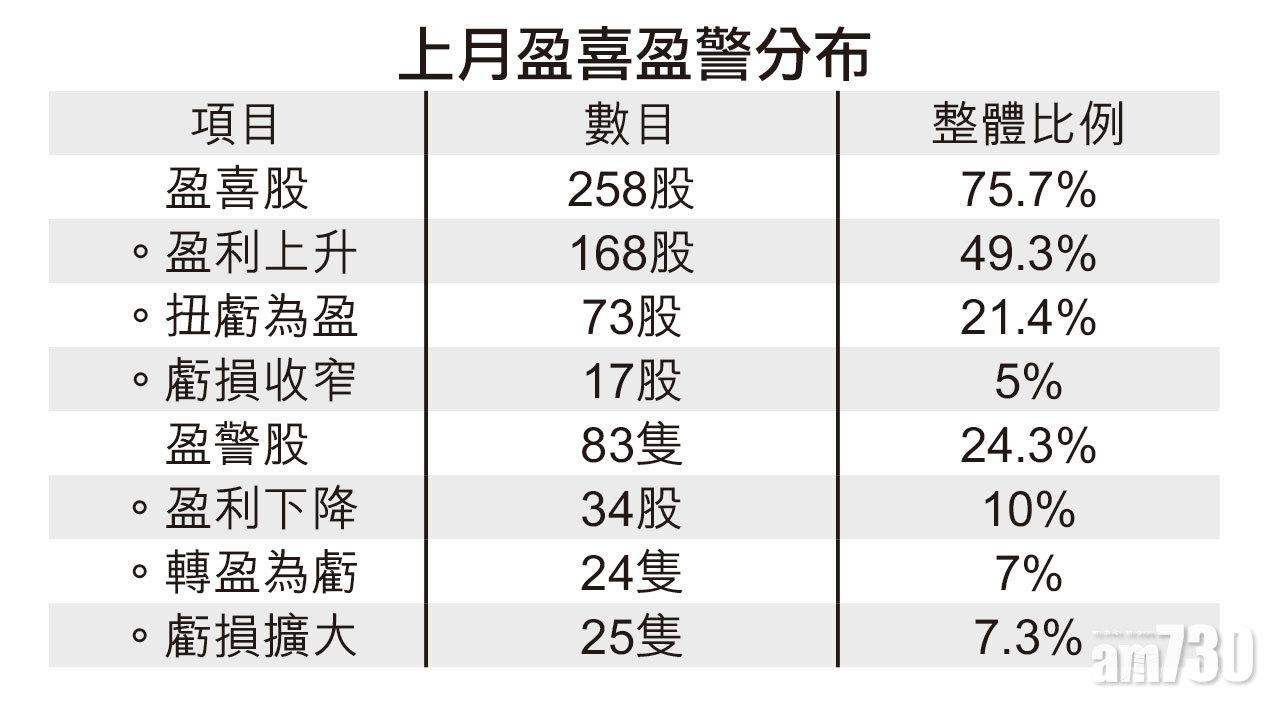 按統計,上月258隻盈喜股中,168隻或64.1%預估盈利明顯上升,73隻或28.3%預料由虧損轉盈利,17隻或6.6%則預測虧損可大幅減少。至於盈警股只有83隻,當中四成預估盈利大減,三成預測由盈轉虧,另外三成則虧損擴大。