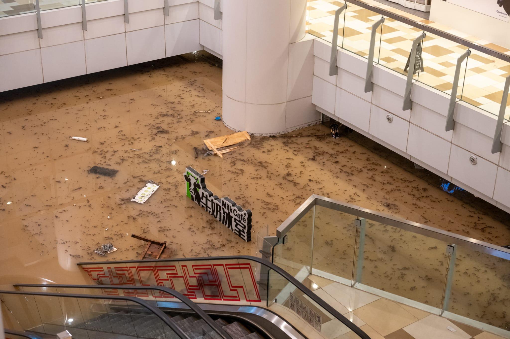 黑雨|黃大仙中心全層水浸餐廳沒頂,餐牌雜物飄浮。(陳奕釗 攝)