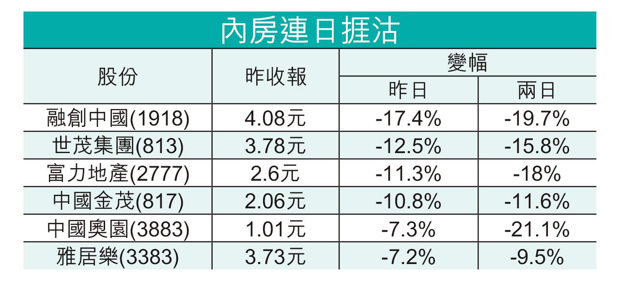 內房及物管股連日逆市跌成重災區,碧桂園服務(6098)放榜後走低4.9%,為表現最差藍籌;宣布延發業績並將在4月1日停牌的融創中國(1918)挫17.4%,同樣情況的中國奧園(3883)未跌夠,昨再瀉7.3%,兩日已累跌21.1%;中國金茂(817)放榜後亦瀉10.8%;早前盈警的世茂集團(813)及富力地產(2777),前者大跌12.5%,後者失11.3%,連跌5日,累挫26.6%。