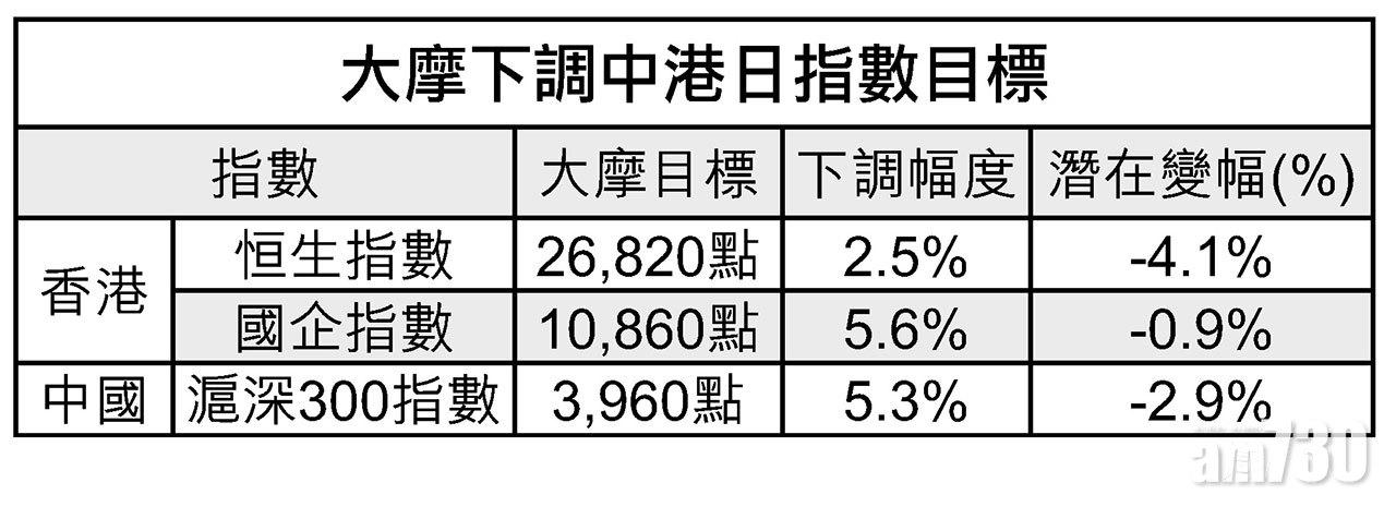大摩同時下調國企股指數及滬深300指數目標,前者降5.6%至看10,860點,潛在跌幅0.9%;後者看3,960點,下調5.3%,較現水平低2.9%。至於恒指最牛預測為32,300點,即再升15.5%或逾4,300點;但最熊目標只看19,300點,即最悲觀或瀉逾8,600點或31%。