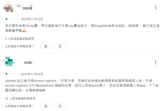 在Android用戶使用的「Google Play應用商店」內,不少Android用戶在應用程式下評論表達不滿,並表示應用程式不能截圖,令轉賬後無法留下記錄。