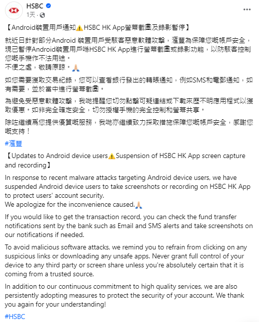 其後滙豐官方於社交平台發文,表示近日針對部分Android裝置用戶,受駭客惡意軟體攻擊,為保障用戶的帳戶安全,現已暫停Android裝置用戶於滙豐手機App進行螢幕截圖或錄影功能,以防駭客控制手機作不法用途。