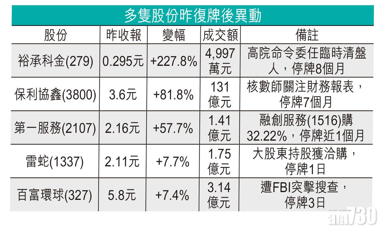 另一隻焦點復牌股為前身為民眾金融科技的裕承科金(279)在今年2月底,因陷財困及被高院命令委任臨時清盤人而停牌,惟日前獲「白武士」、新世界發展(017)執行副主席兼行政總裁鄭志剛入股並重組成功,因而達復牌條件。裕承科金昨高見0.335元,即一度飆2.7倍,收市報0.295元,仍升近2.3倍,創上市以來最大升幅,並為2019年5月6日後新高,成交額4,997萬元。