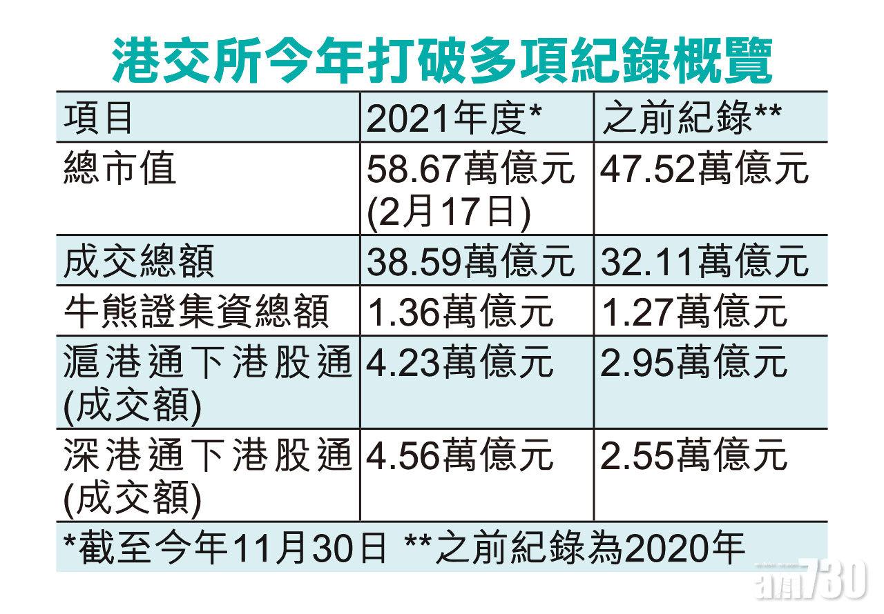 港交所指,成交額及前三季度業績均創新高,現貨股票市場日均成交額按年增32%,至1,715.1億元;衍生產品日均成交量升3%。截至今年11月底,市值42.88萬億元,按年挫近一成,首次公開發售(IPO)集資2,987億元,跌25.3%,新股數量83間,較去年全年154間,減46%。截至上周五則有92隻新股上市,集資3,189億元,均由去年高位回落。