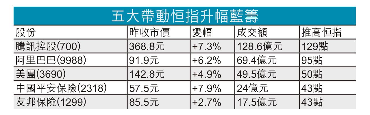 ATMJ齊飆升,阿里巴巴(9988)收91.9元,增6.2%或5.4元,成交69.4億元,騰訊收報368.8元,升7.3%或25.2元,成交128.6億元,美團(3690)收142.8元,漲4.9%或6.7元,成交49.5億元;京東集團(9618)揚5.5%或9.6元,報183.3元,成交18.5億元,合共推高大市301點,佔升市逾36%,成交共266億元。