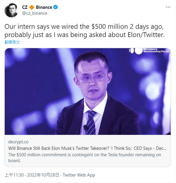 趙長鵬於11月28日在貼文中指出,作為交易的一部分,「幣安在兩天前已匯出 5 億美元」。(網上截圖)