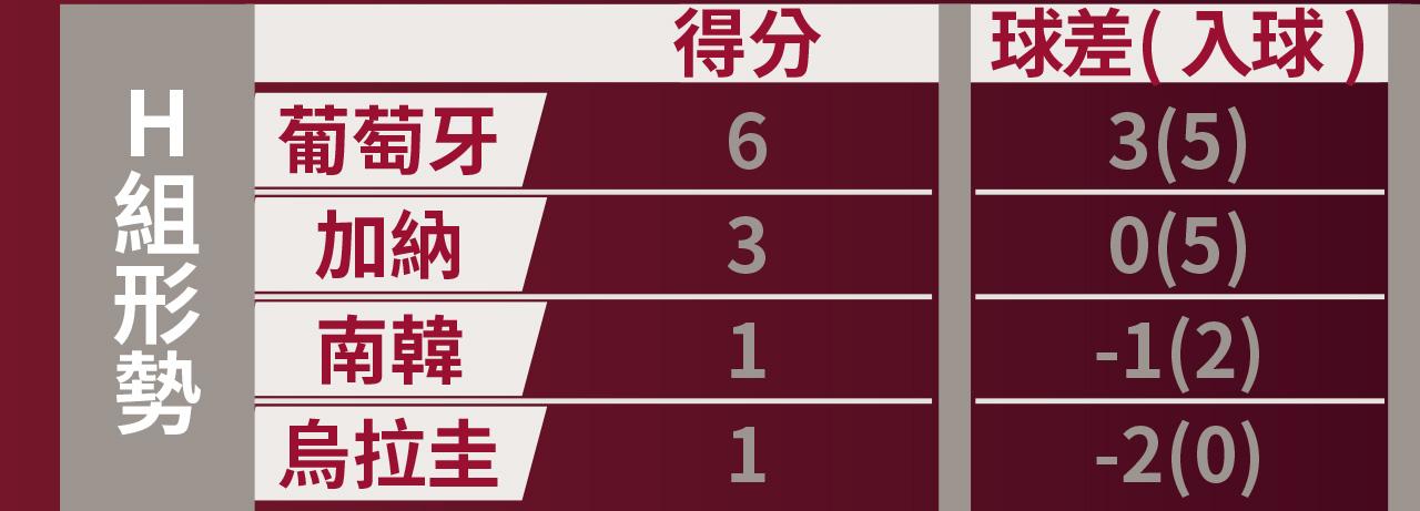 H組同時間的生死大戰,由非洲「黑星」加納惡鬥南美「三哥」烏拉圭(02/12 23:00) ,不期然令人回想起2010年世盃8強戰,該場蘇亞雷斯白界線前用手救球被逐,但對方射手基恩主踢極刑宴客,結果戰至互射12碼烏拉圭勝出的經典比賽。現時形勢卻是有多名星級鋒將在陣的烏拉圭,兩戰1分兼一球不入;反觀3分在手的加納,今場贏波肯定出線;若南韓無法擊敗葡萄牙,加納和波亦足夠打入16強;烏拉圭若今場3分,同時南韓贏波的話,兩隊將同得4分,則先要計得失球,賽前南韓領先1球,故烏拉圭勢必要爭取多入球,以爭取出線。
