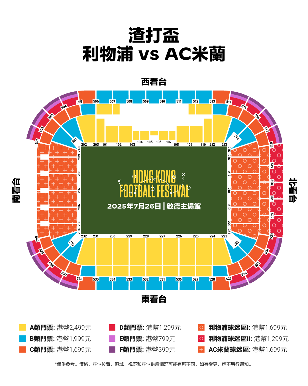 4支歐洲足球勁旅利物浦、AC米蘭、阿仙奴及熱刺,7月底會在啟德進行兩場表演賽。門票在下周一(12日)上午10時起在Cityline公開發售,門票介乎399至2,499元。主辦單位又為早前預售前,部份球迷區門票售罄的情況,決定為利物浦球迷會提供額外的預售門票。