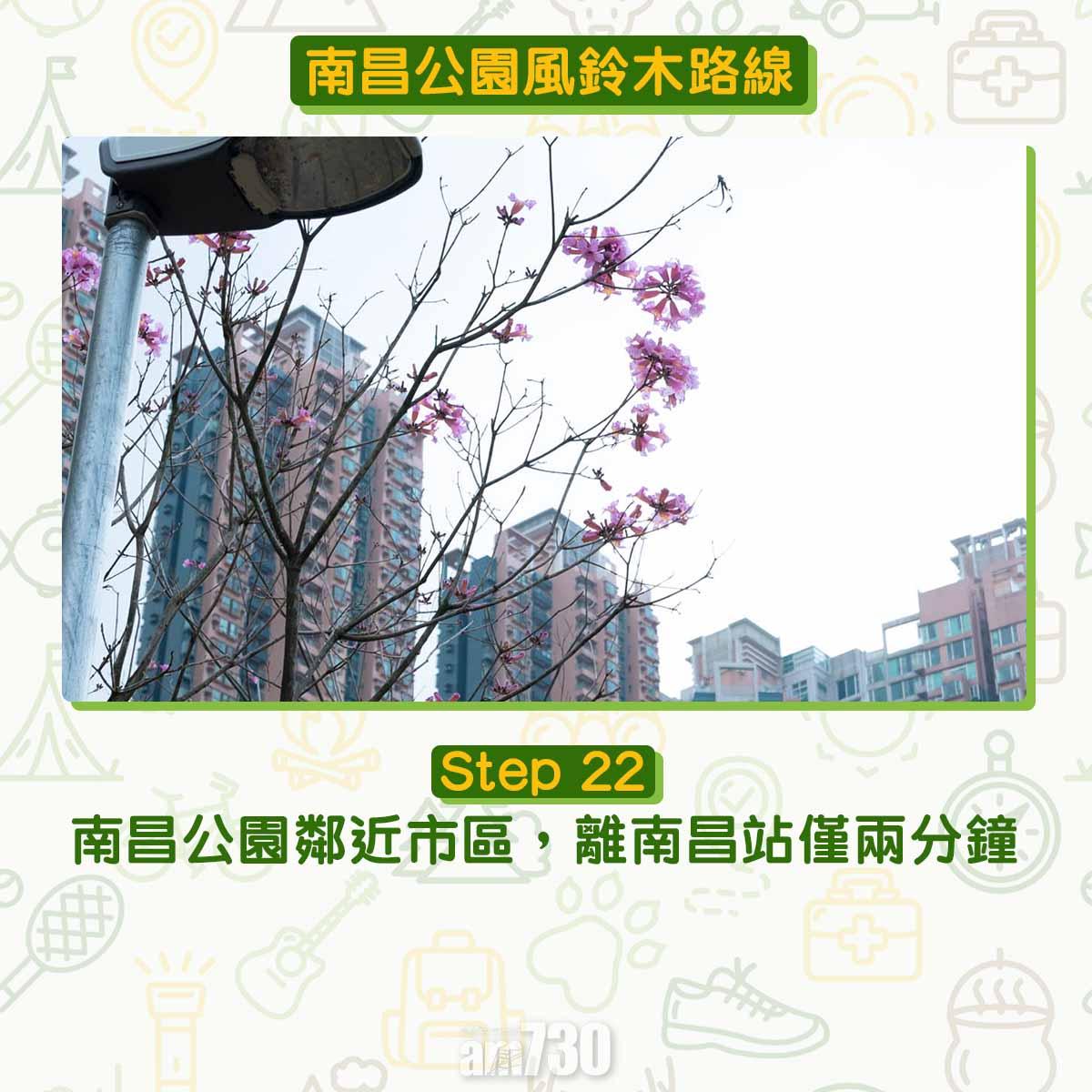 位於南昌站及深水埗間的南昌公園在1998年7月啟用,約4.74公頃佔地種植了數十棵黃花風鈴木,另有數棵紅花風鈴木。風鈴木分佈在圓形廣場及兒童三輪車遊樂區一帶,而整個公園甚至都公園外圍的欽州西街都有黃花風鈴木。黃鐘木又名黃花風鈴木,是南美洲委內瑞拉國樹,屬落葉喬木,花葉不相見。至於紅花風鈴木又名巴拉圭風鈴木,是薩爾瓦多國花。風鈴木花期由3至4月,風鈴木花期短,開花為時約一兩周內就凋謝,所以想與黃金雨花海打卡,就要把握時間。