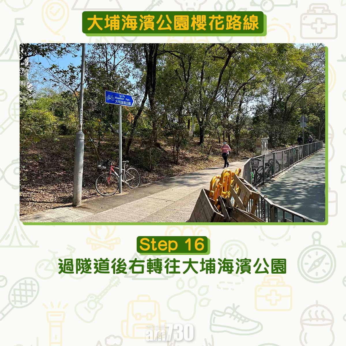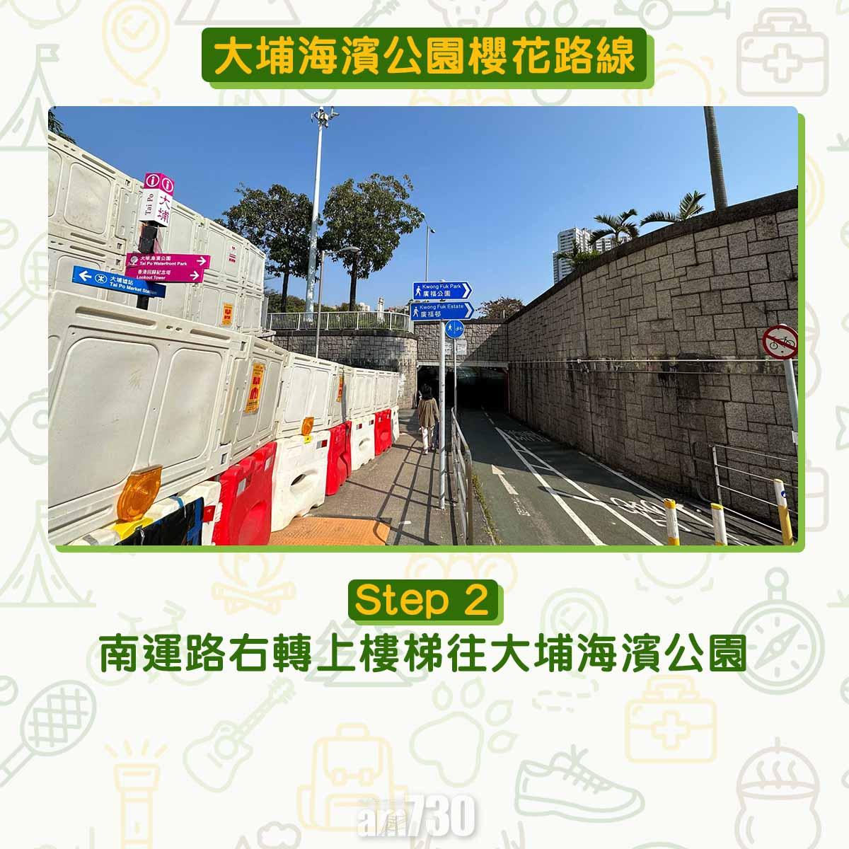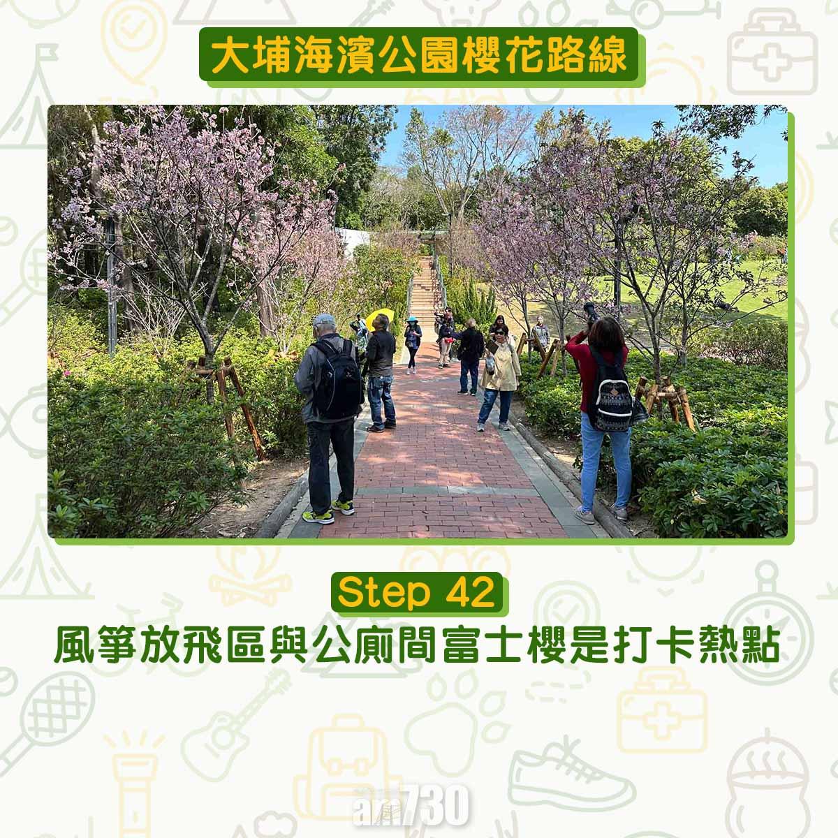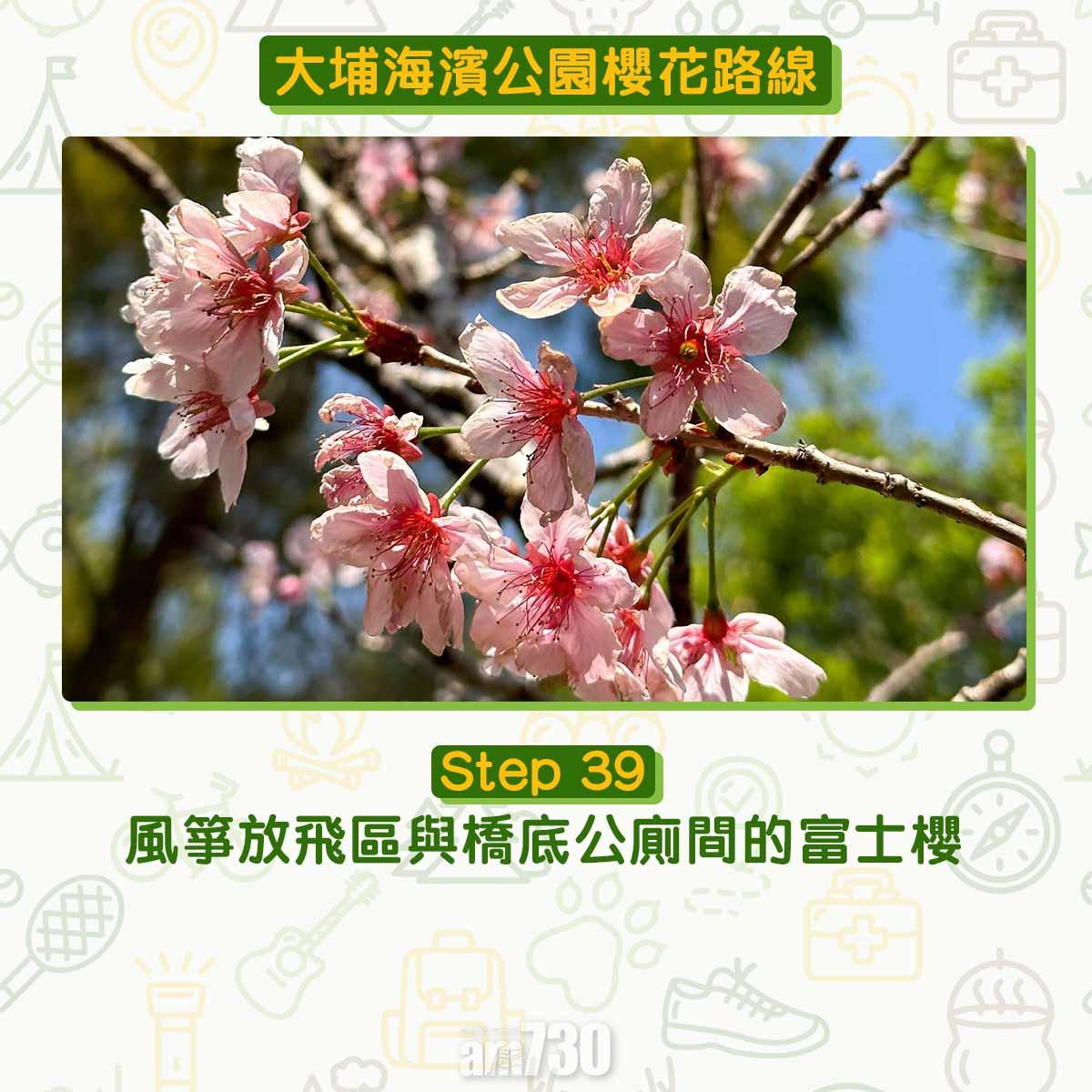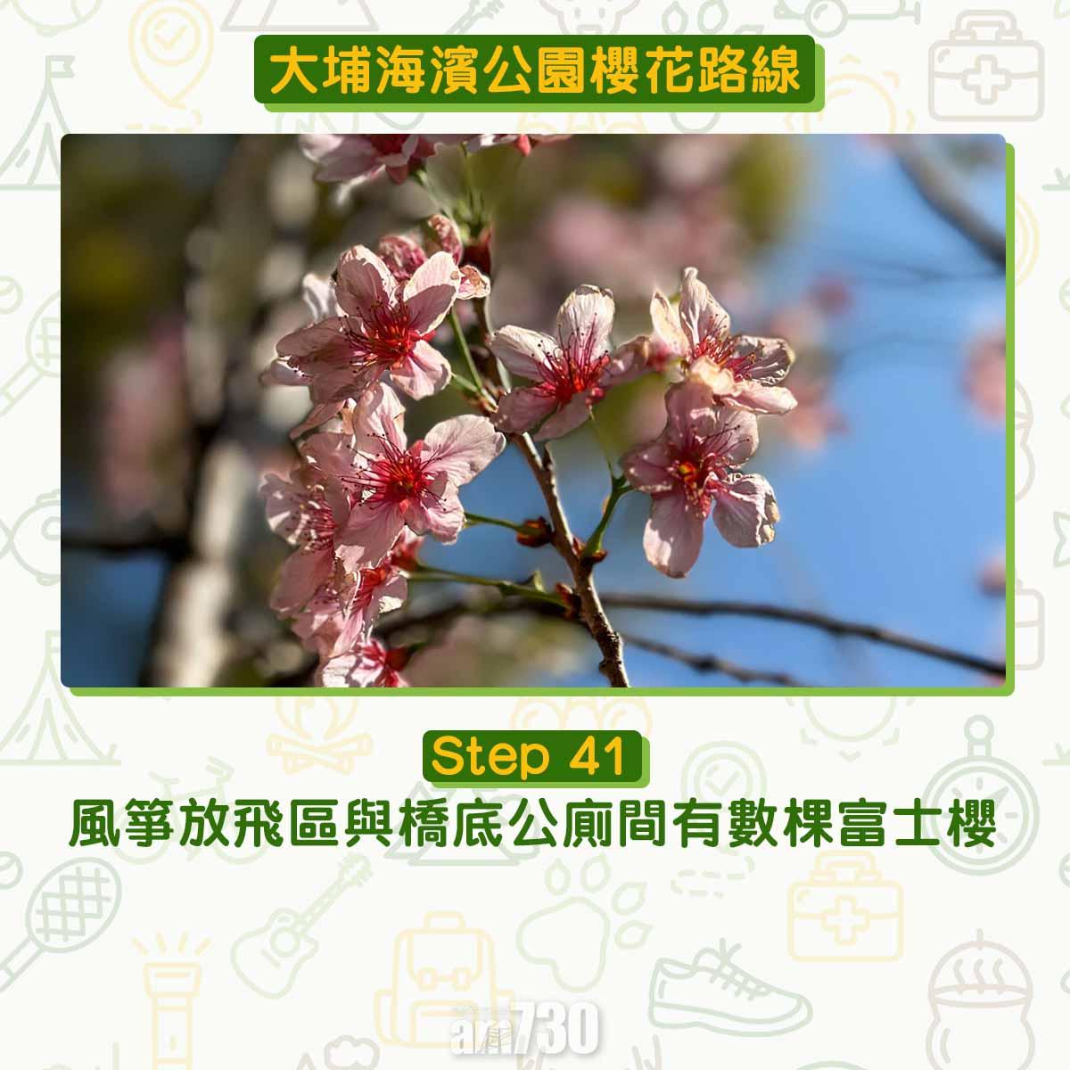 風箏放飛區與橋底公廁間︰即大埔海濱公園地圖的(5)與(7)間,當眼處種植了數棵富士櫻,高度非常適合打卡拍照。