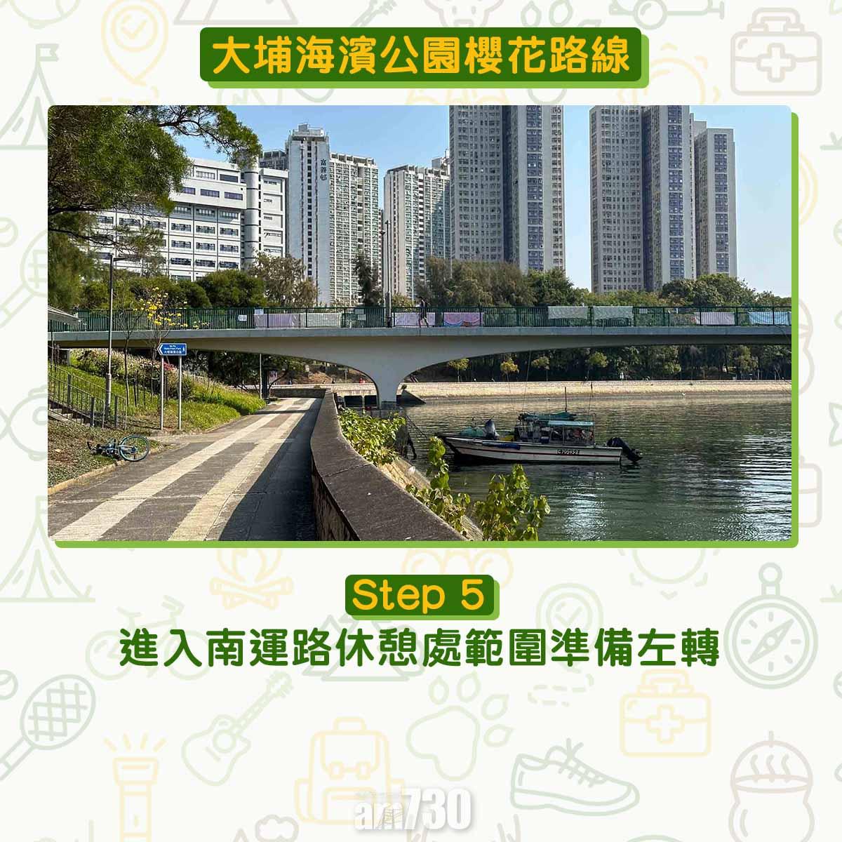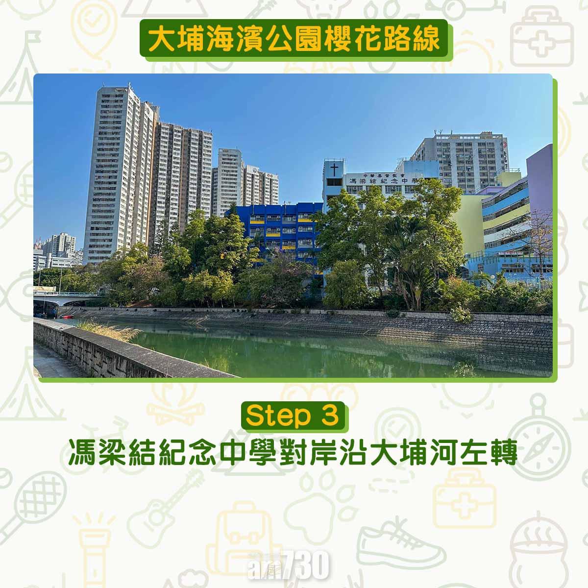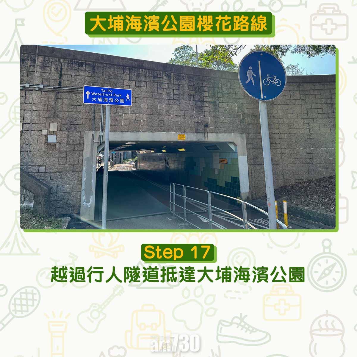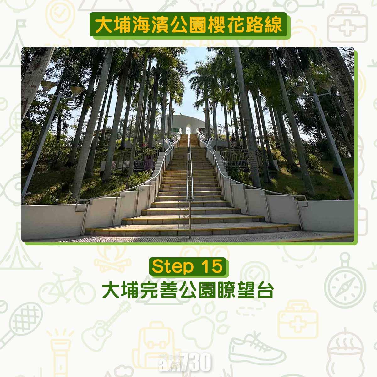 風箏放飛區與橋底公廁間︰即大埔海濱公園地圖的(5)與(7)間,當眼處種植了數棵富士櫻,高度非常適合打卡拍照。