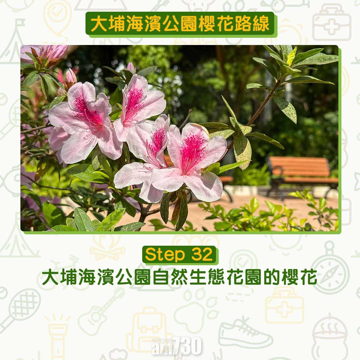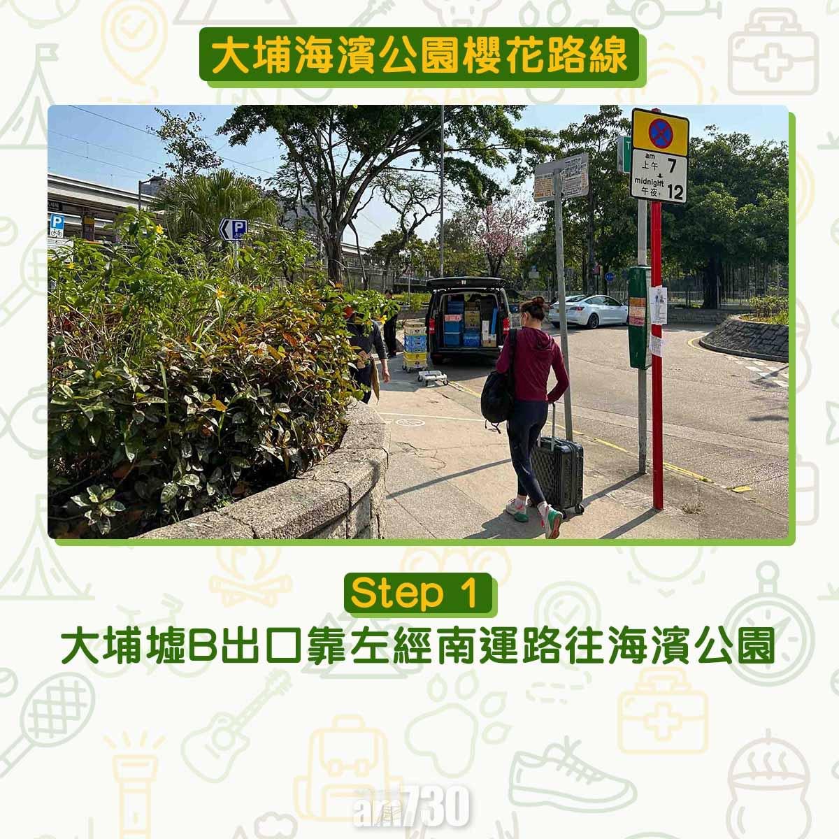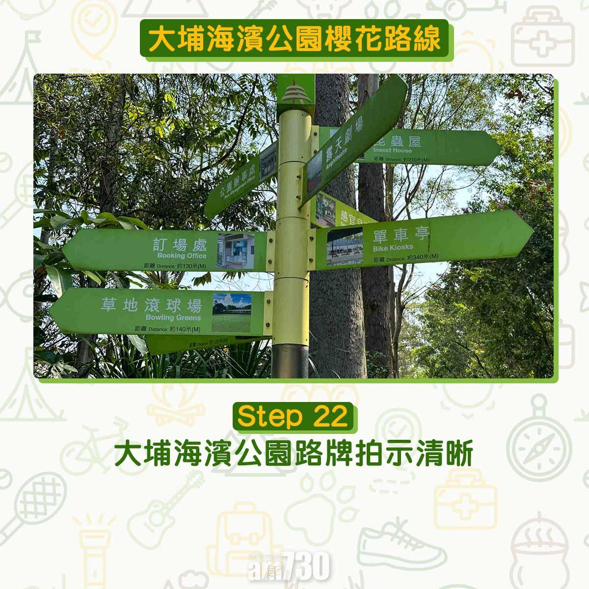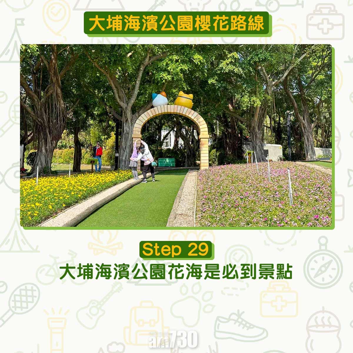 大埔海濱公園種植共70多棵品種不一的櫻花,包括八重櫻、富士櫻、墨染櫻、重瓣山櫻花、鐘櫻花、昭和櫻。到訪當日部份櫻花未開或已凋謝,只列出部份大埔海濱公園櫻花位置。