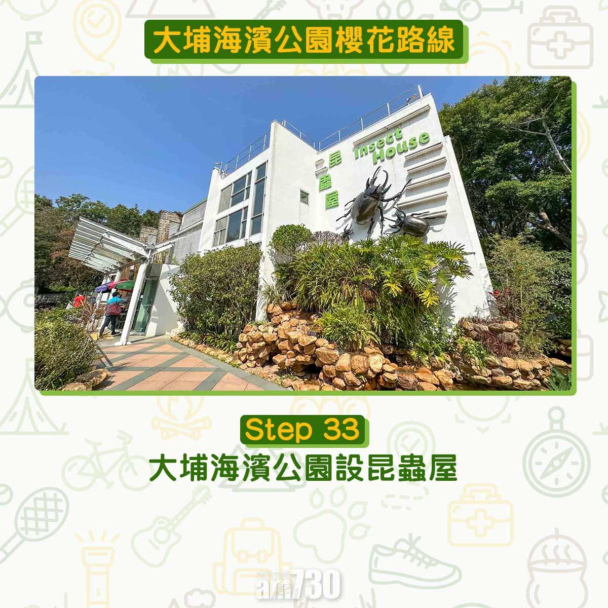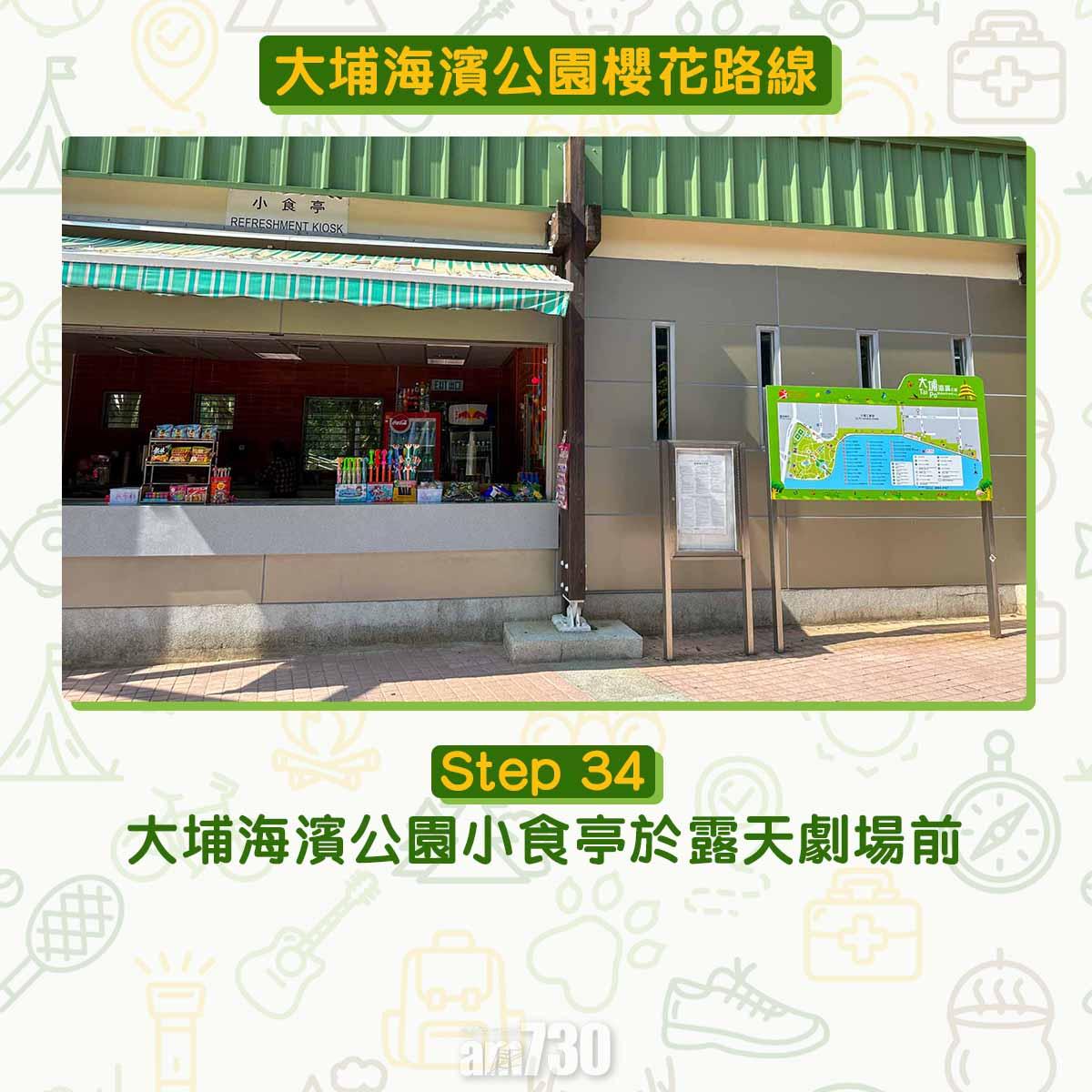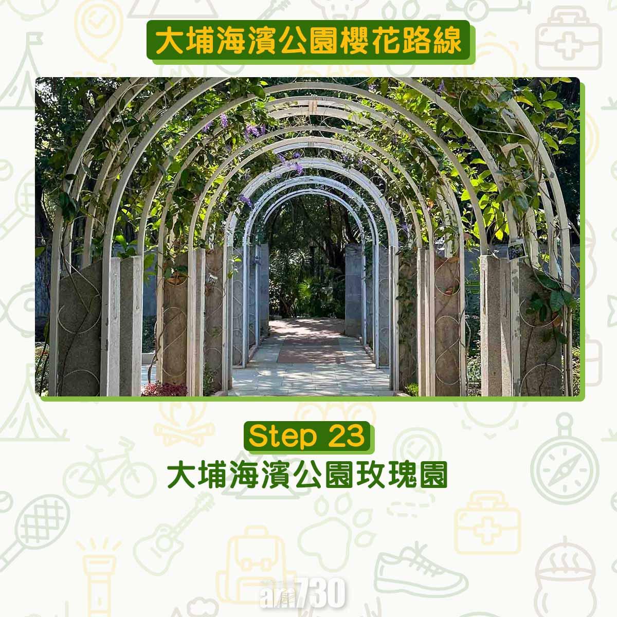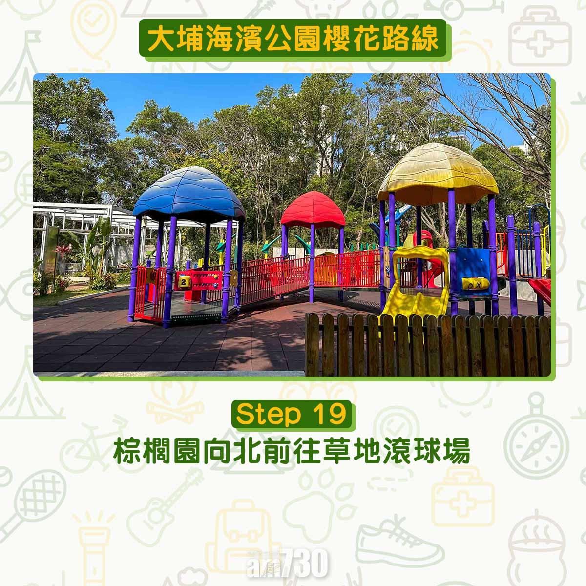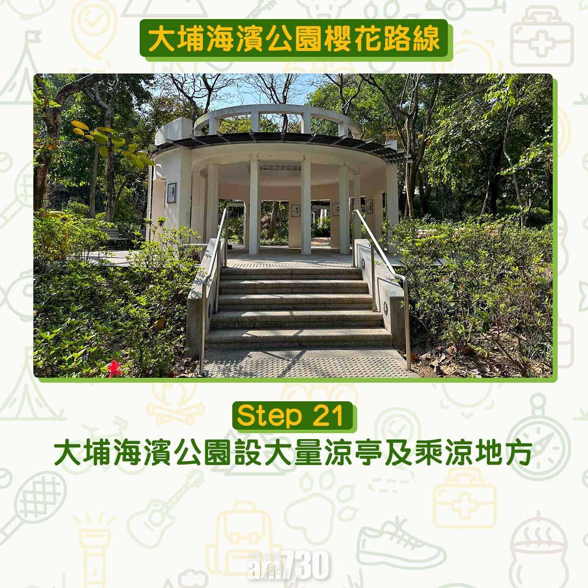 大埔海濱公園種植共70多棵品種不一的櫻花,包括八重櫻、富士櫻、墨染櫻、重瓣山櫻花、鐘櫻花、昭和櫻。到訪當日部份櫻花未開或已凋謝,只列出部份大埔海濱公園櫻花位置。