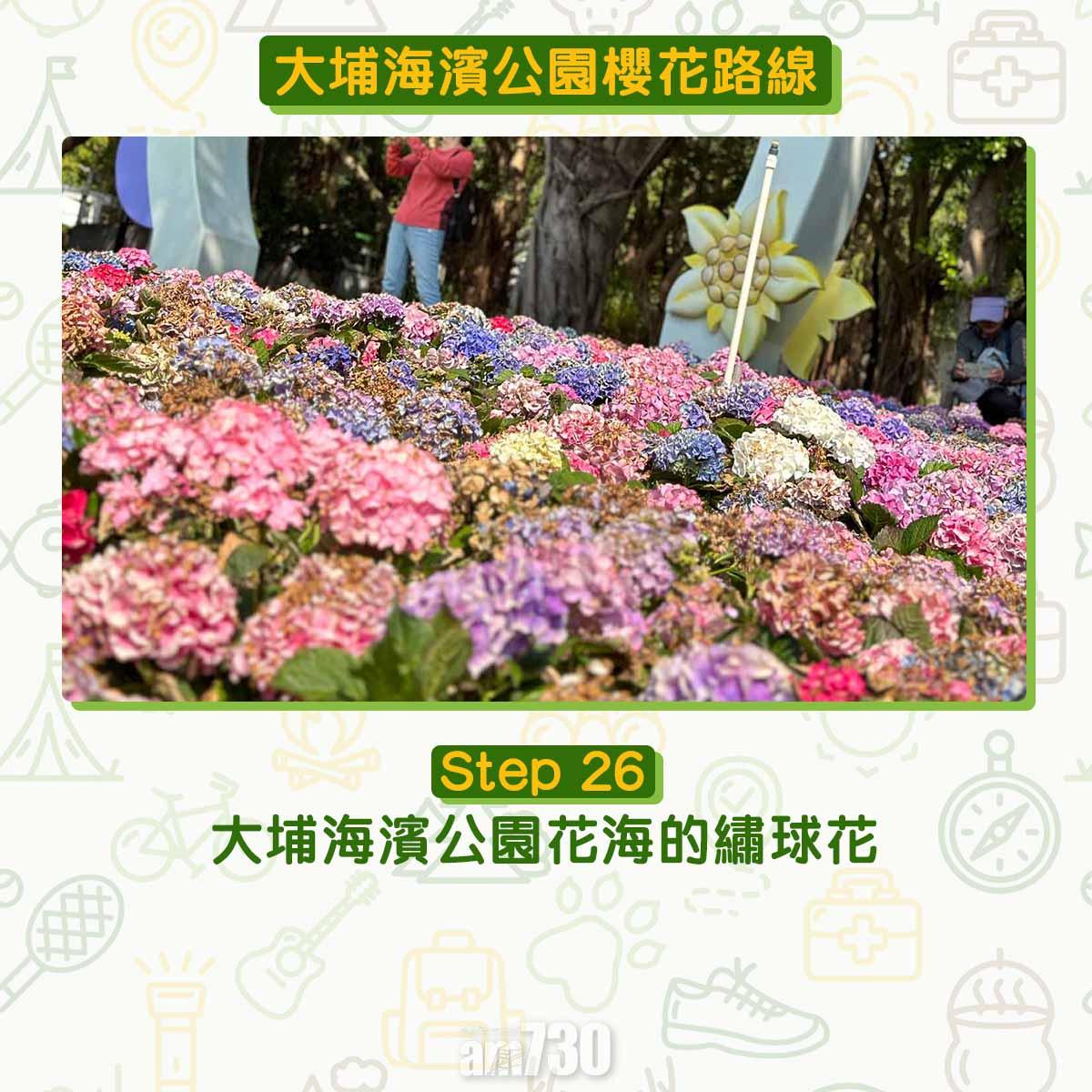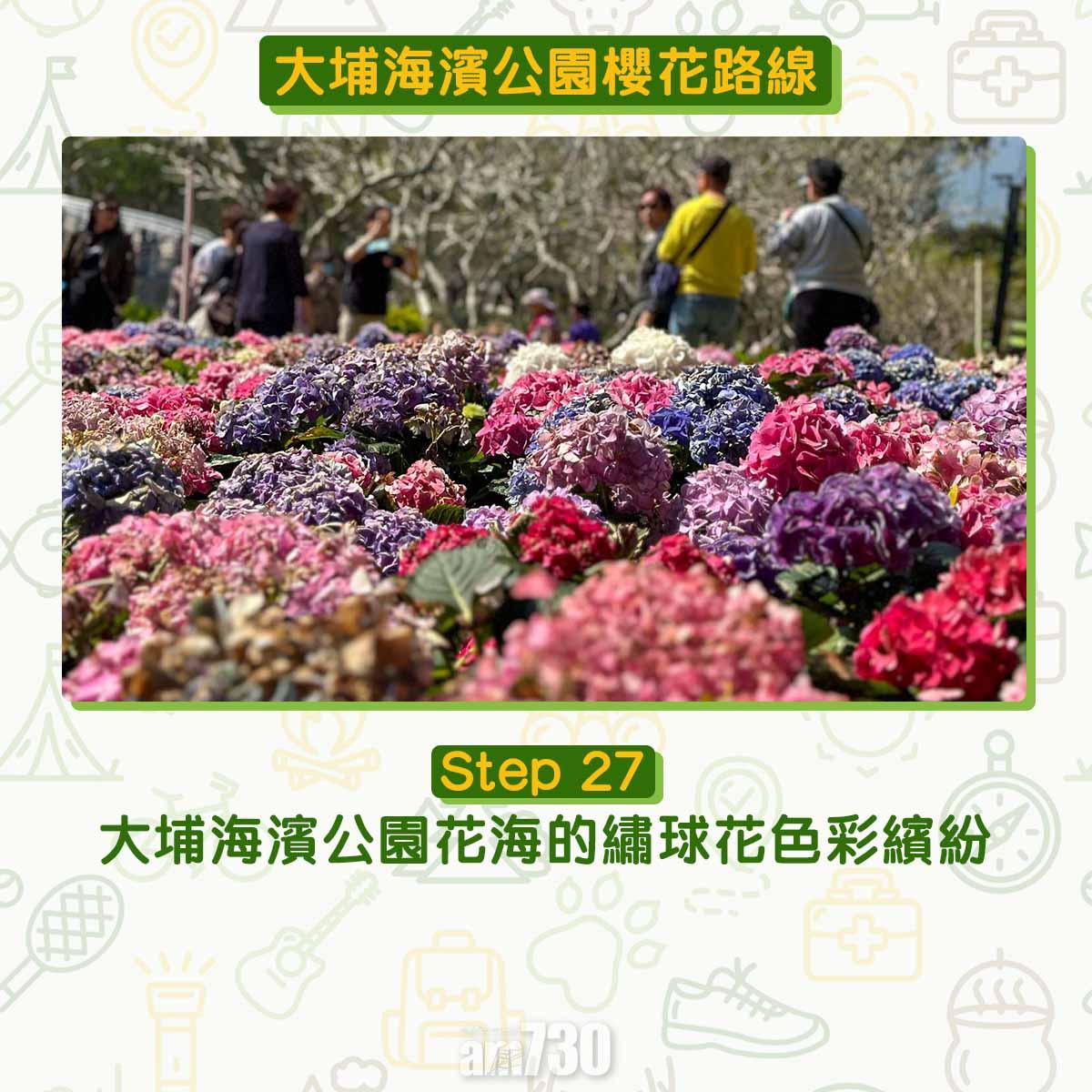 繡球花花期由春季至夏季,香港繡球花花期約3月至5月。繡球花分佈在大埔海濱公園各處,於回歸記念塔前的花海(12)最密集,球狀的花瓣非常容易辨別,五彩繽紛。不過繡球花有毒,要避免皮膚接觸汁液。根據醫院管理局資料,繡球花中毒徵狀包括過敏性皮炎包括濕疹、皸裂和發炎,主要出現於手指。進食繡球花的話更有機會產生噁心、嘔吐、腹瀉、腹痛。