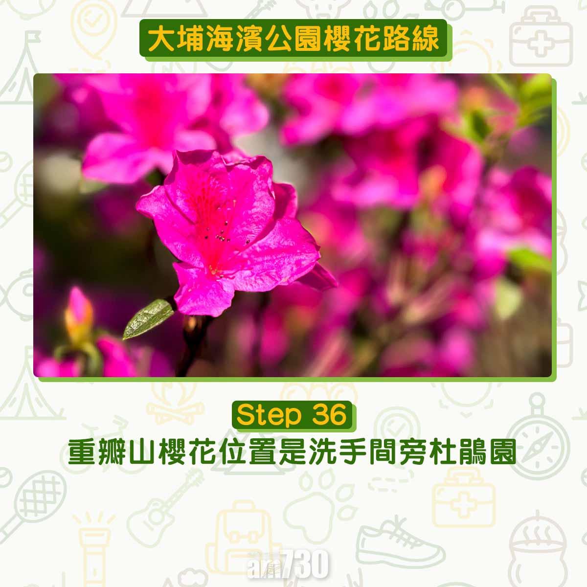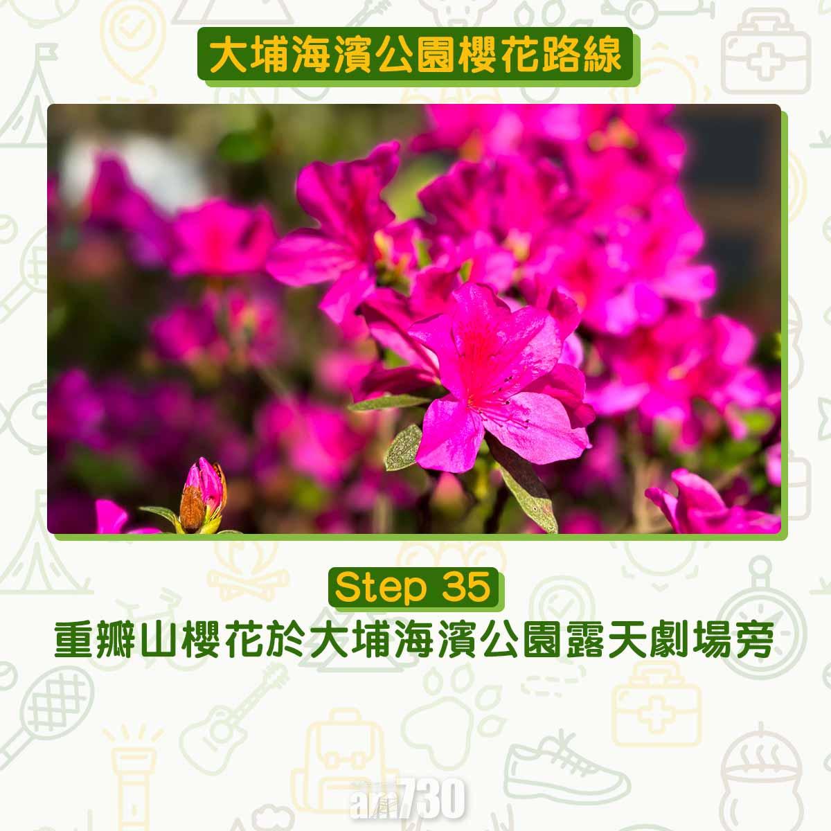 重瓣山櫻花︰於大埔海濱公園露天劇場(17)旁洗手間的杜鵑園小山坡找到重瓣山櫻花。又名八重櫻,花瓣為徘紅色,濃豔的紅色不難認出。