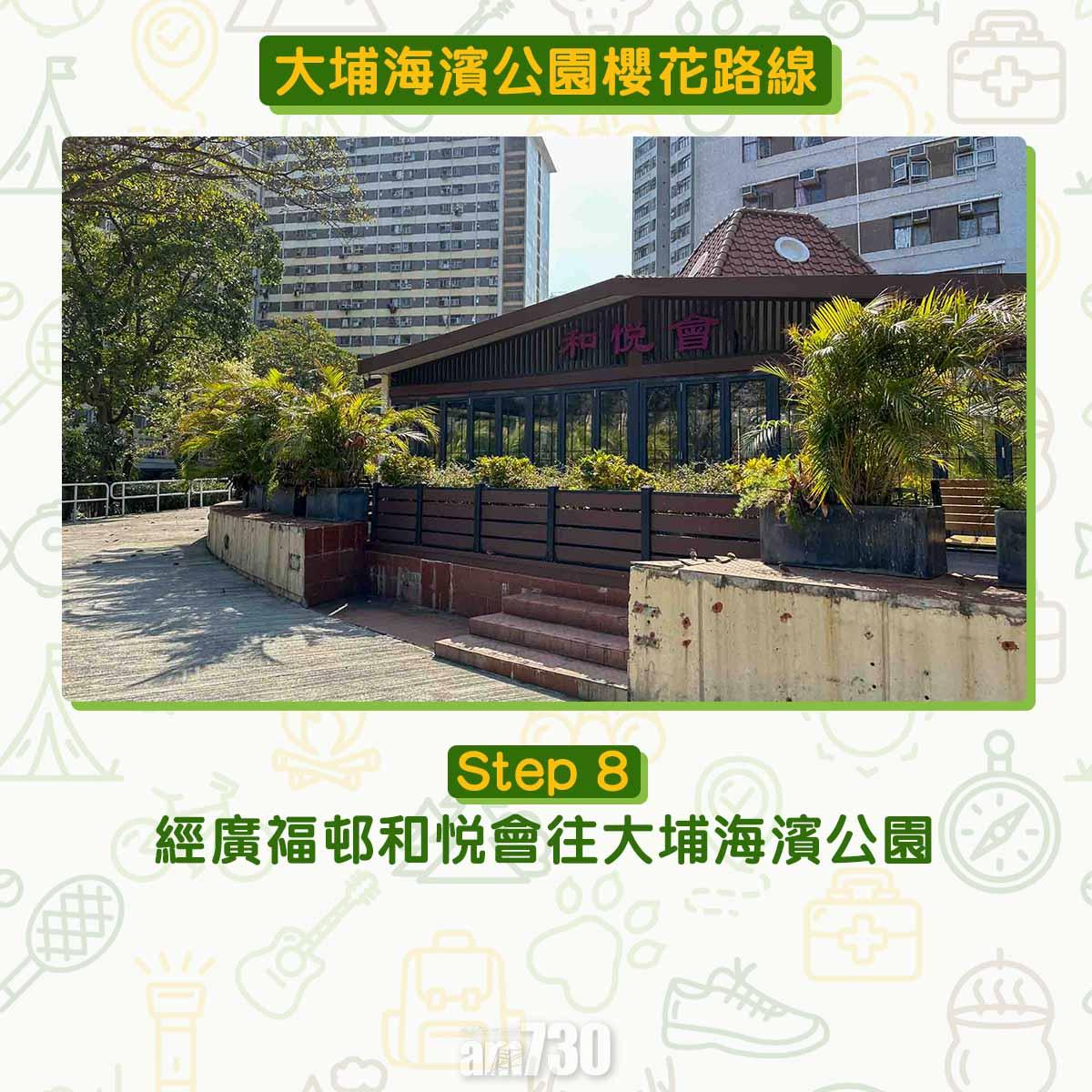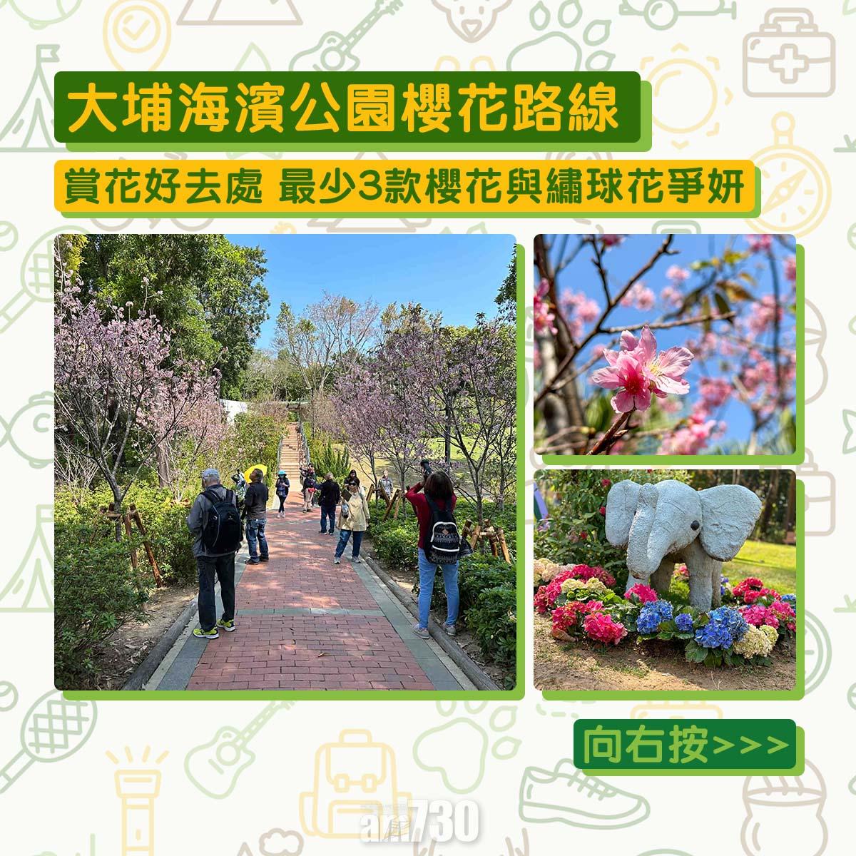 大埔海濱公園是賞櫻花好去處。櫻花花期約在2月下旬至3月,在佔地約22公頃的大埔海濱公園親子遊、賞花、踩單車,大埔海濱公園設施齊全包括租借單車、小食亭、洗手間、地圖,附近設泊車位,一家大細郊遊、放風箏、放電、賞櫻花、繡球花,任君選擇。