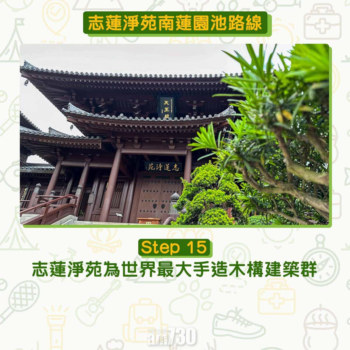 志蓮淨苑(Chi Lin Nunnery)及南蓮園池(Nan Lian Garden)由一條橋連接,距離鑽石山站僅5分鐘,是香港一日遊著名景點。作為世界最大手造木構建築群,其彷唐代及日本建築配合、盆景、羅漢松,像回到過去。蓮池倒影把「港版金閣寺」圓滿閣昇華,晚上夜遊格外迷人。