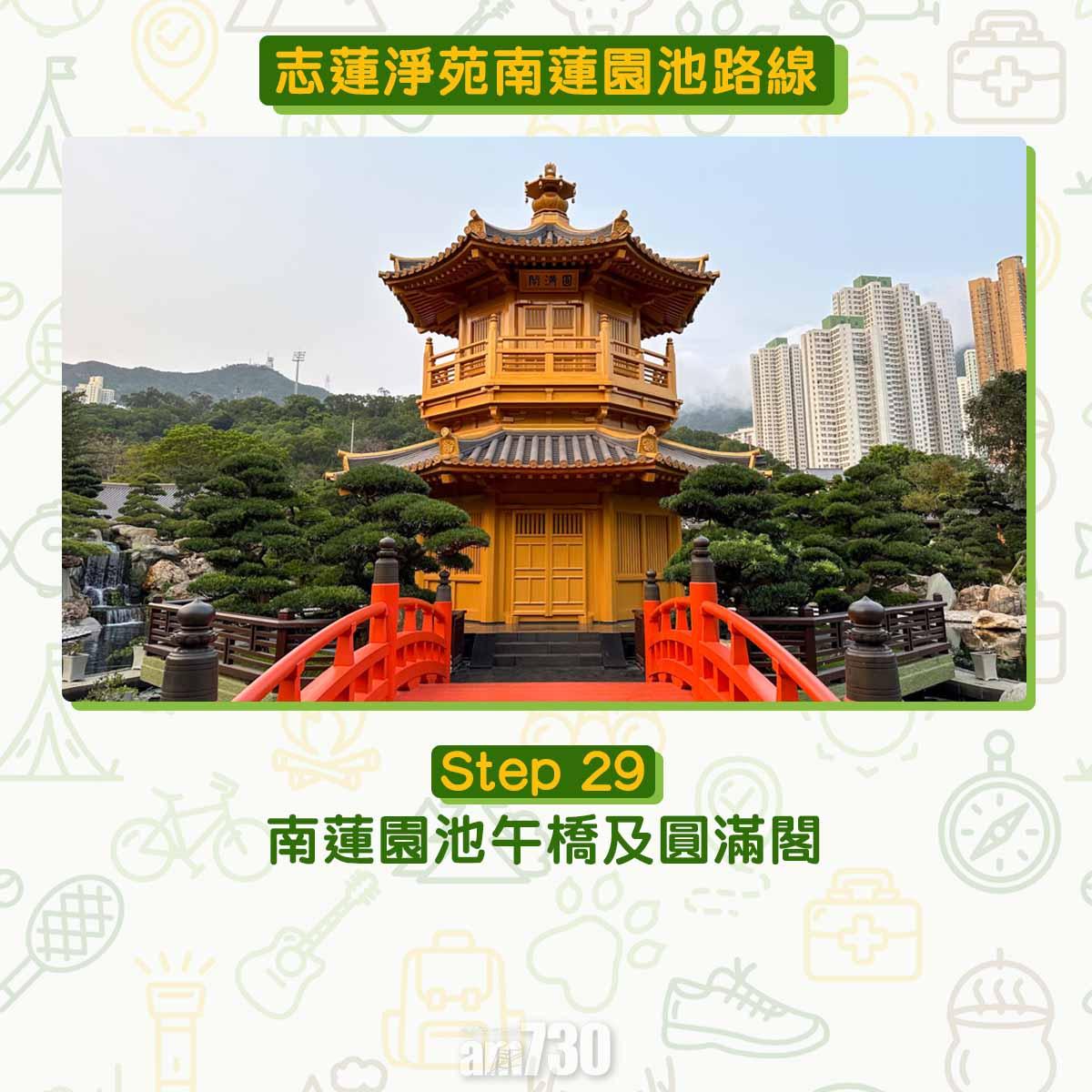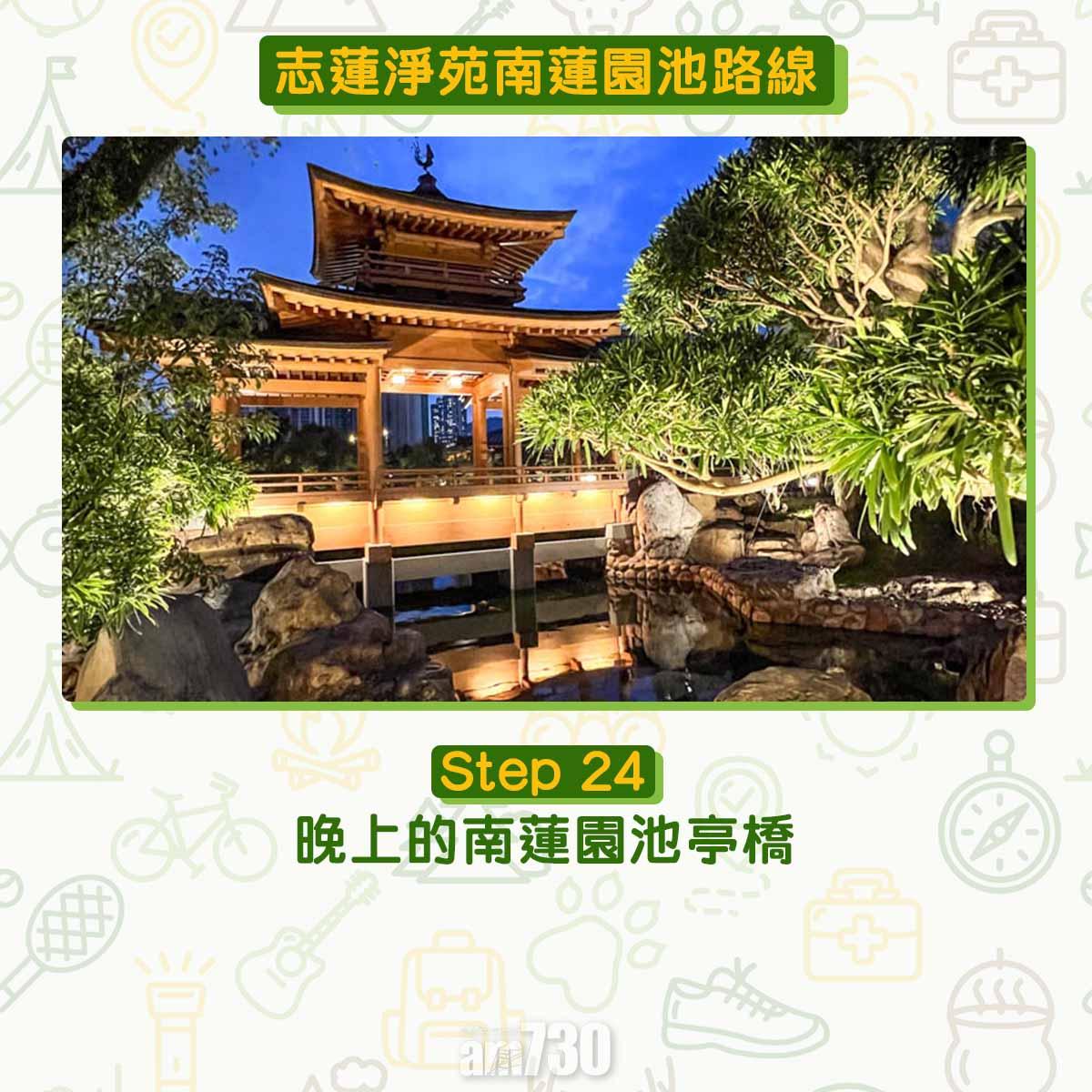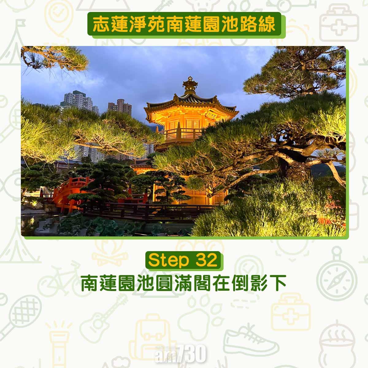 某天朋友問我有沒有去過南蓮園池,他晚上到訪驚為天人,開心分享靚相,只能用金碧輝煌形容。於是筆者決定黃昏前到訪南蓮園池。平日下午的南蓮園池遊人不多,水流聲不斷,把馬路的汽車聲消音,如同離開了城市。實測過5月到訪時,晚上約7時左右就會亮燈。亮燈後經水月臺回望亭橋,湖水把金光複製,絕不能錯過。經香海軒到午橋前,3層的圓滿閣確是金碧輝煌,被冠以「港版小京都」或「港版金閣寺」不算誇張。