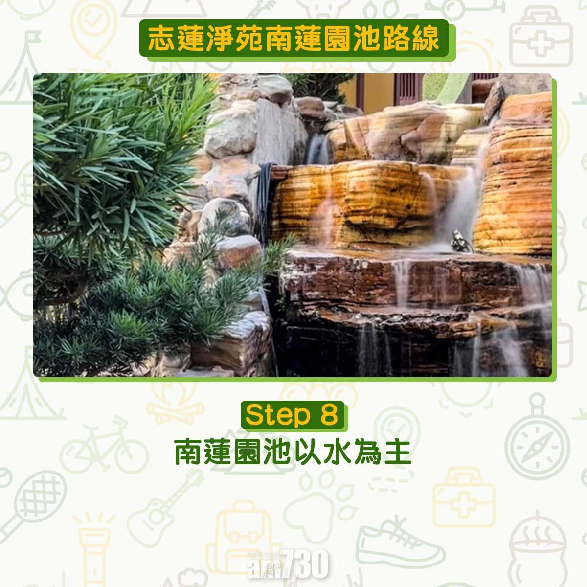 由志蓮淨苑原路折返蓮臺,沿子橋、松北路、石館等順時針遊覽南蓮園池。才子李純恩指南蓮園池原為唐代建築,但卻被日本好好保留這傳統。事實上團隊在設計南蓮園池及志蓮淨苑時,曾到訪日本參考當地唐朝風格建築或古寺,足證李純恩所言非虛。南蓮園池以隋唐郡府園林絳守居園池為藍本,以中央蓮池及蒼塘的水池為主體。石館經唐風小築及水車磨坊,人工瀑布後為素菜館龍門樓,到訪幾次都充著外國遊客在人工瀑布前打卡。