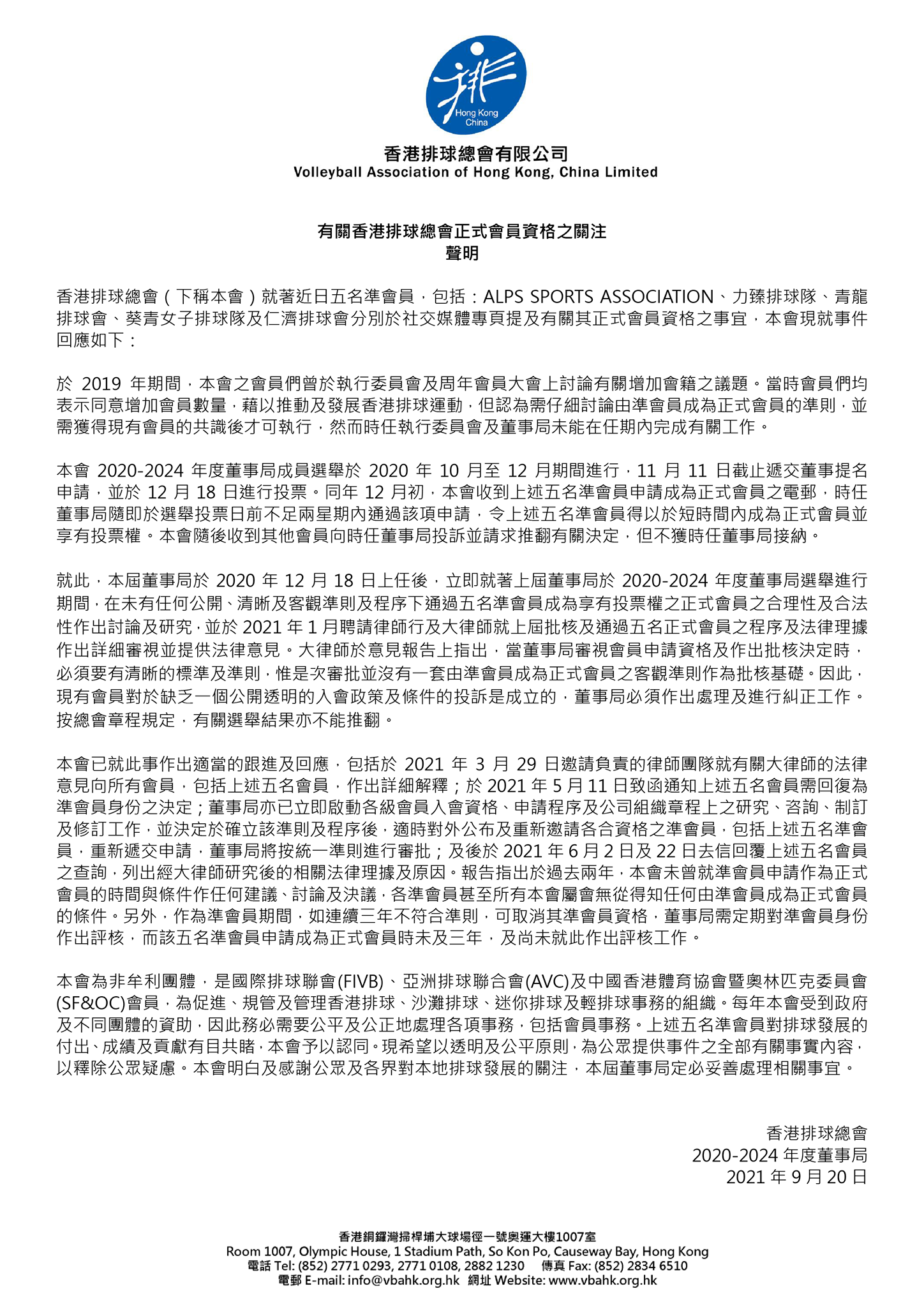 早前有5支香港排球隊,在香港排球總會的會員資格遭到取消。5隊早前發聲明批評排總的決定不公。排總昨傍晚回應有關決定,指5支球隊的會員資格獲上屆董事會通過,但現屆董事會認為決定欠缺清晰準則,例如在當時大會選舉前兩周方獲批准並取得投票權,因而受其他會員投訴,但不獲上屆董事會接納,而現屆董事會則接受,並且決定取消5隊的會員資格。