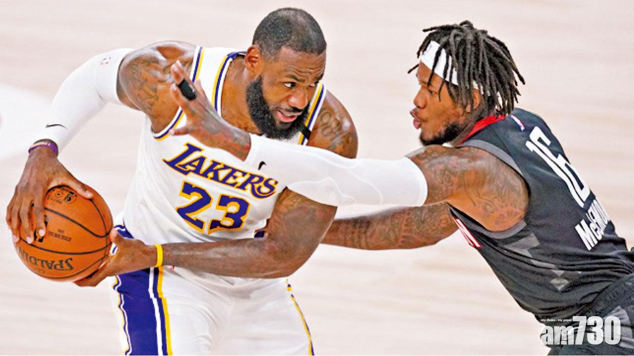 NBA季後賽西岸次圈第三戰,湖人藉著勒邦占士(圖左)攻入36分並有4次封阻,加上另一主將安東尼戴維斯交出「雙雙」的26分及15個籃板,以112比102擊敗火箭,場數反超前2比1。雙方經過3節打成82平手,後備上陣的老牌控衛朗度於第四節開首連取8分,率領湖人打出一段10比0的攻勢,最終保持優勢至完場。朗度今仗攻入21分並有9次助攻,上仗失準的韋斯布祿,今仗為火箭貢獻30分,另一主將夏頓則攻入陣中最高的33分,但仍然難逃輸波厄運。帶領湖人勝出後,占士已獲得162場季後賽勝仗,超越了湖人名宿費沙的161場,成為NBA歷來季後賽贏波場數最多的球員。