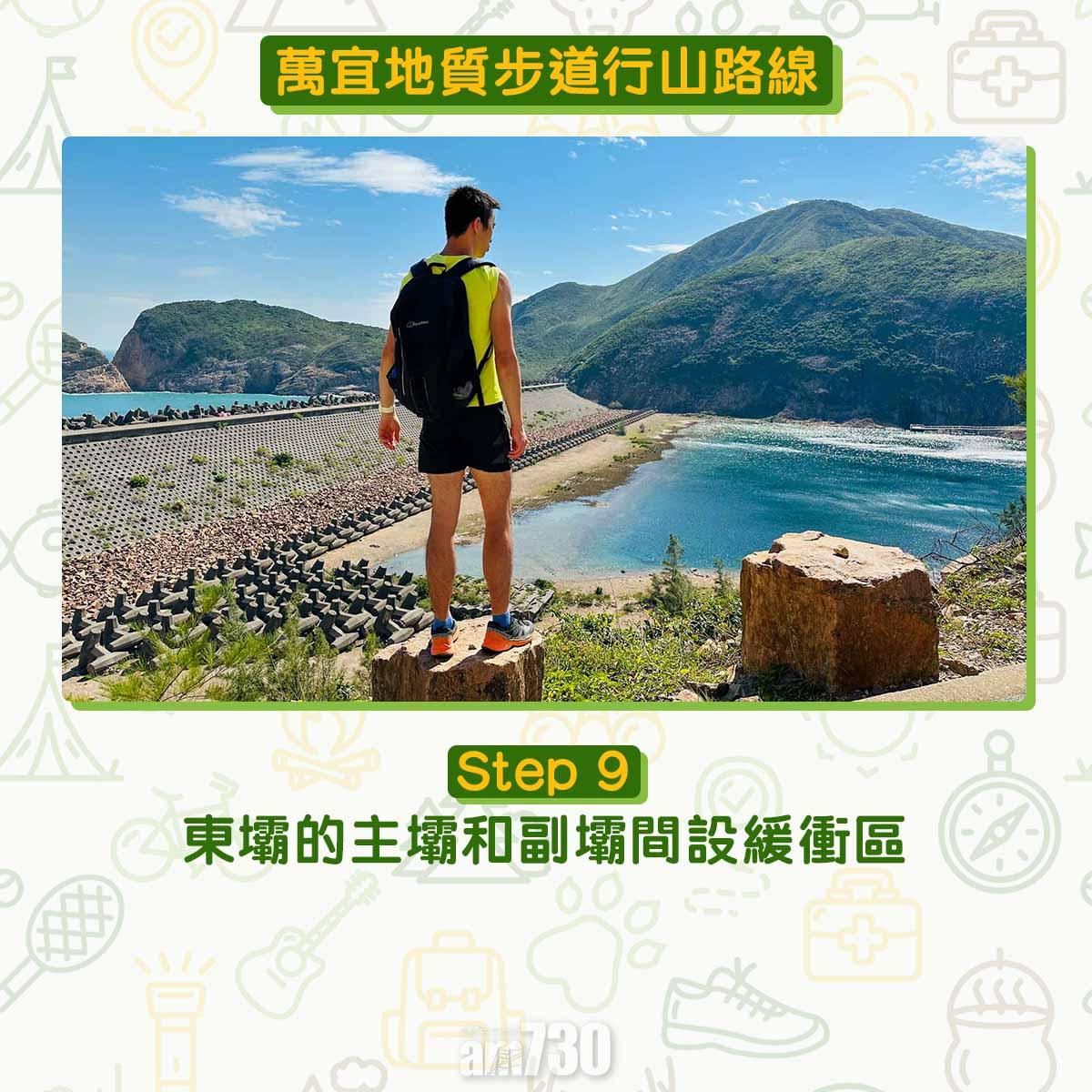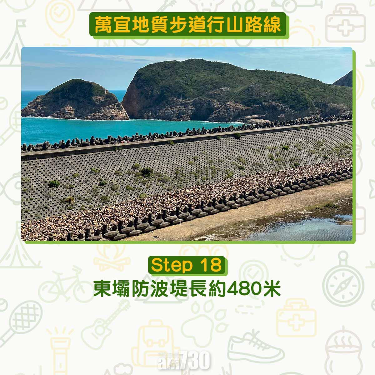 乘的士或小巴到萬宜水庫東壩,沿路風光已教人想盡快跳落車拍照。萬宜地質步道首個景點為小巴站旁的淺藍色紀念碑,紀載1979年供水的萬宜水庫建造時5名犧牲的工人。根據梁榮亨著《香港野外奇觀》,萬宜水庫東壩防波堤,由7千多塊防波石組成。數百米的防波堤連同右方的破邊洲及花山,拍照不停。破邊洲原是花山一部份,但海蝕作用而一分為二,呈現到被切開的氣勢。